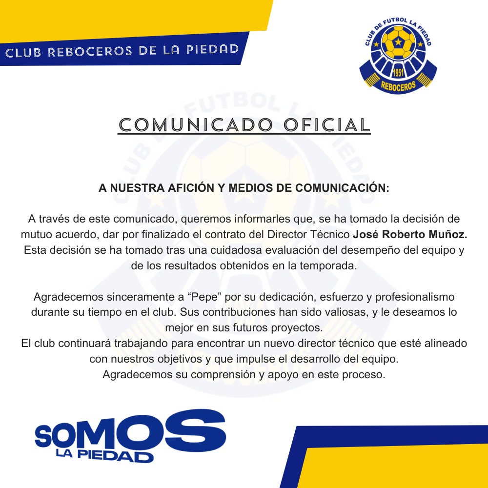 La Piedad, Michoacán. – Después de la derrota en casa de los Reboceros de La Piedad ante el cuadro de Aguacateros CDU por marcador de tres goles a uno, la directiva del cuadro michoacano informó que José Roberto Muñoz deja la dirección técnica del equipo en mutuo acuerdo.