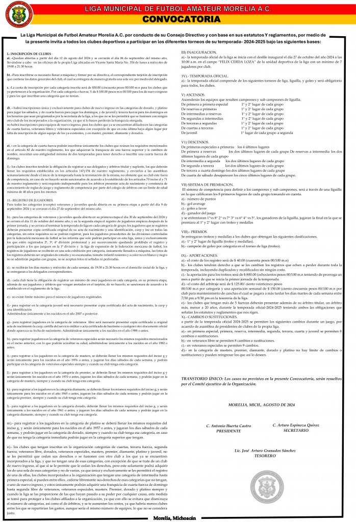 Morelia, Michoacán. – Después de dos años con el formato europeo para ser el campeón de cada categoría, la Liga Municipal de Fútbol Amateur de Morelia dio a conocer en su convocatoria de la Temporada 2024-2025, el regreso de la liguilla para la fase final del campeonato.
