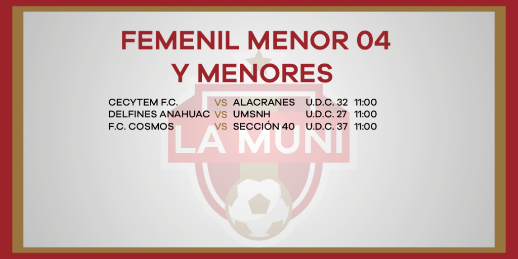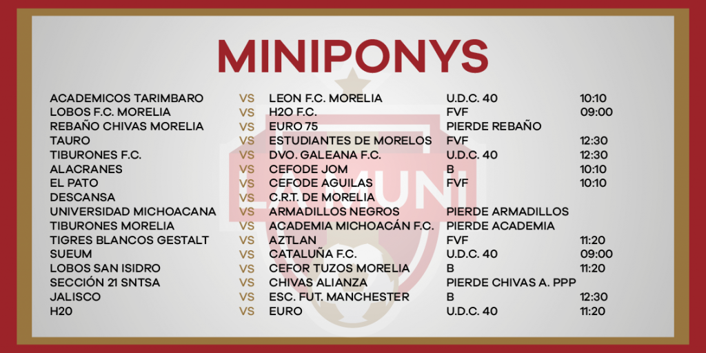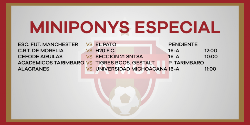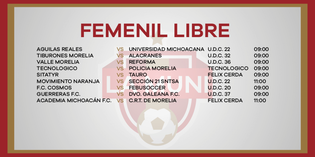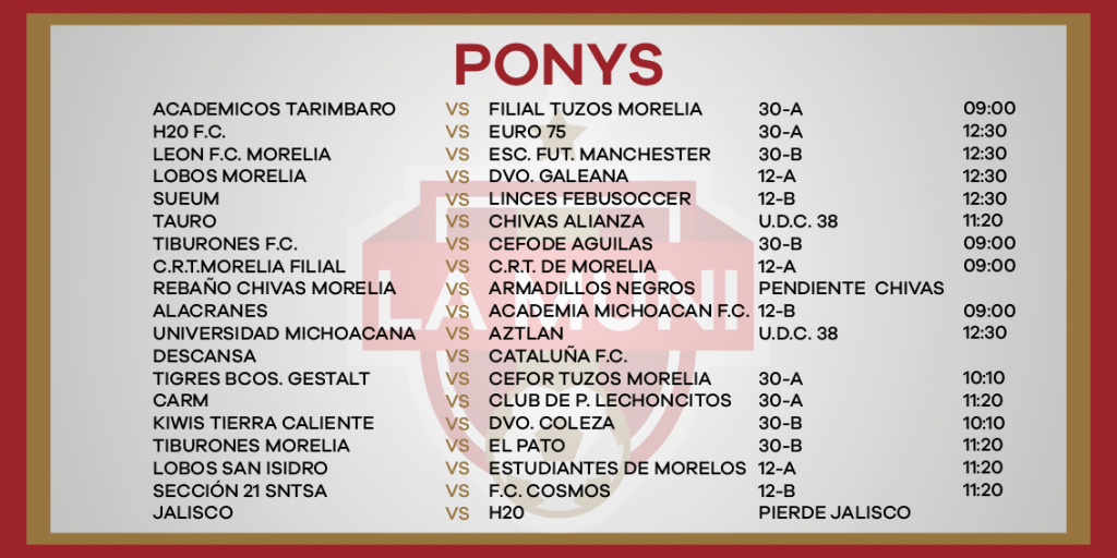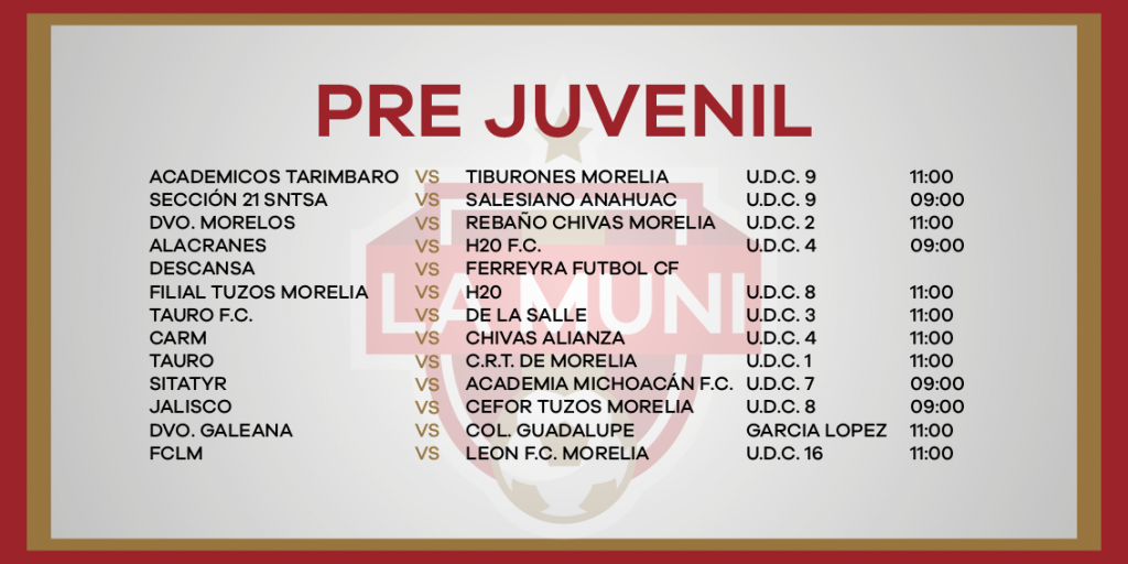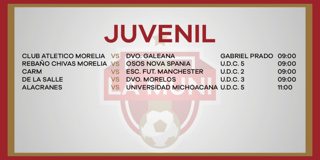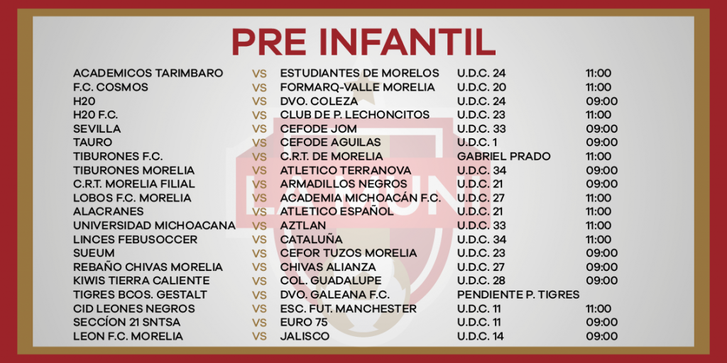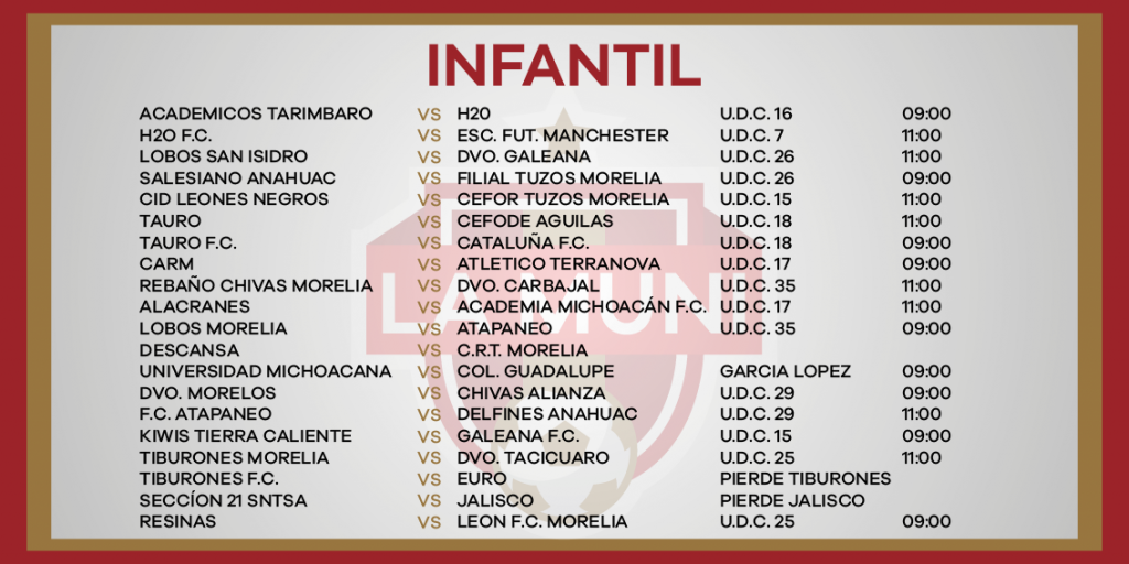 ROGRAMACIÓN RAMA INFANTIL JORNADA 10 enero 24, 2024 Juegos de las categorías menores y femeniles este sábado 27 de enero en la Liga Municipal de Fútbol de Morelia.