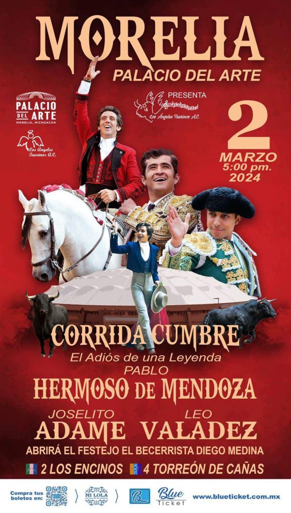 Morelia, Michoacán. – Tras 25 años de trayectoria en el suelo mexicano y 35 en el mundo del toreo, la leyenda del rejoneo Pablo Hermoso de Mendoza se despedirá de los ruedos michoacanos el próximo sábado 2 de marzo acompañado de las grandes figuras mexicanas Joselito Adame y Leo Valadez con ejemplares de Los Encinos y Torreón de Cañas en punto de las 17:00 horas.