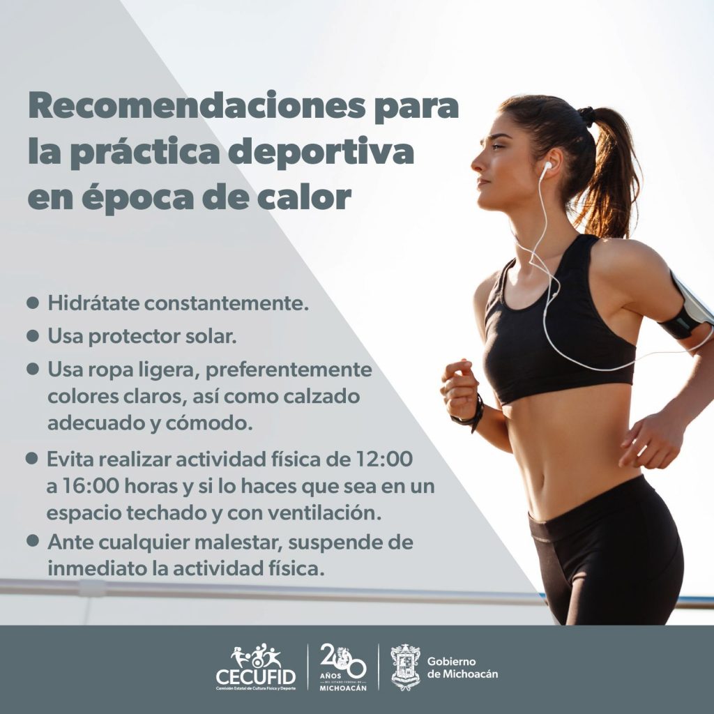 La Comisión Estatal de Cultura Física y Deporte (Cecufid) señala que se debe evitar la actividad física de 12:00 a 16:00 horas, que es cuando la temperatura está por encima de los 25 grados y de realizarse en ese horario, debe ser en espacios techados y ventilados.