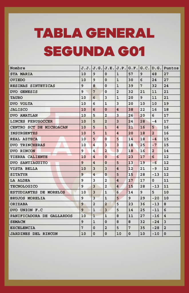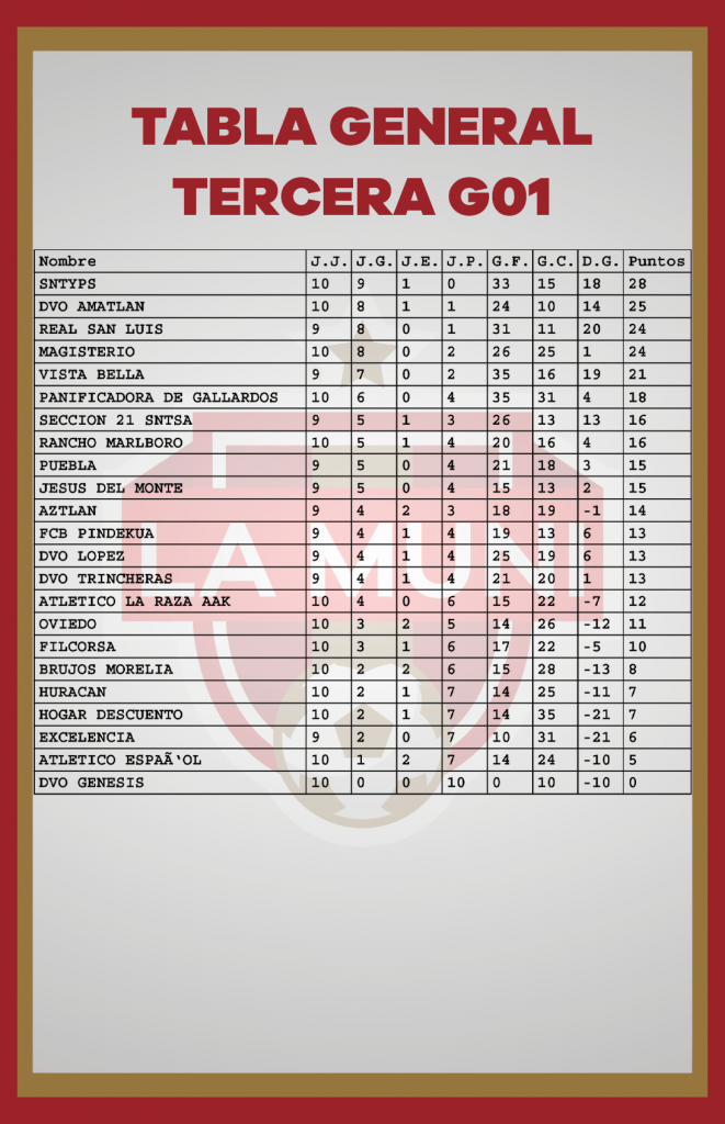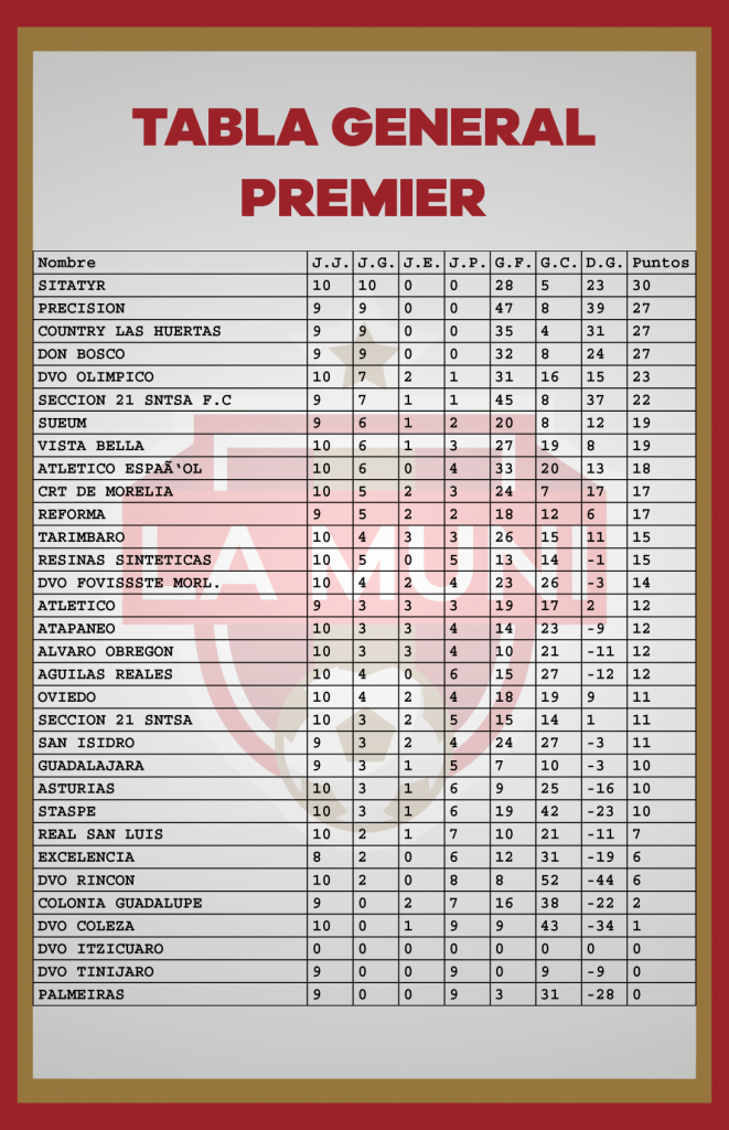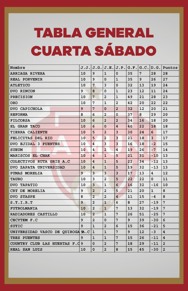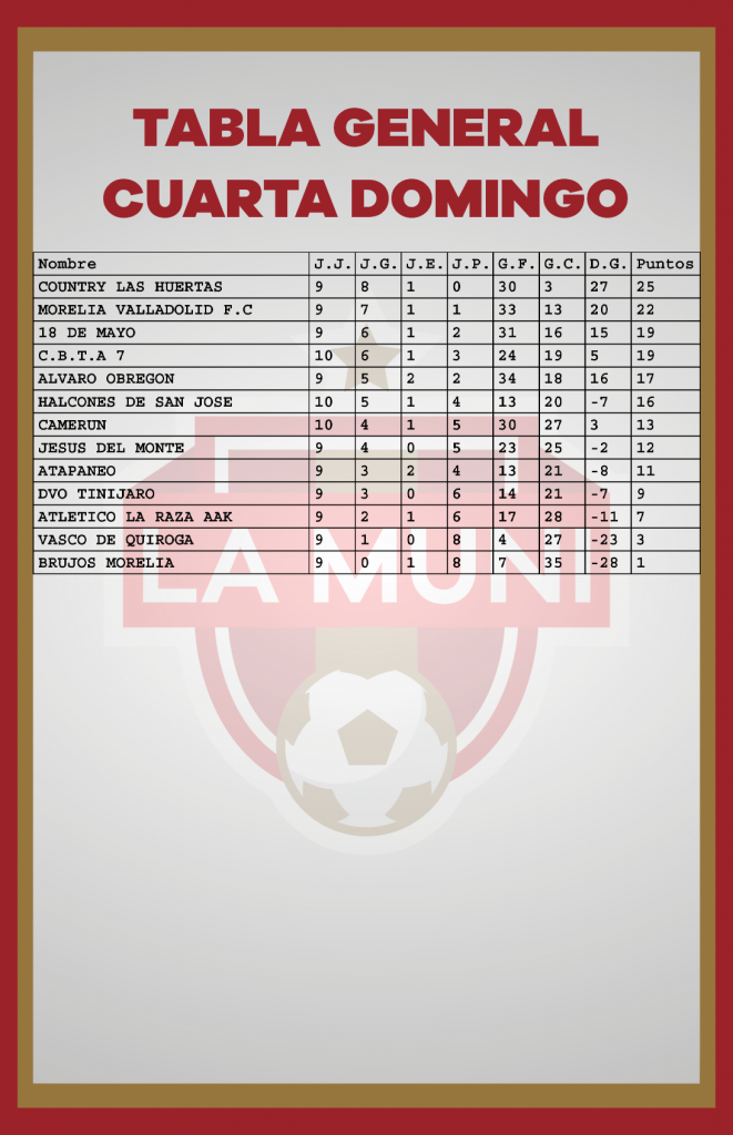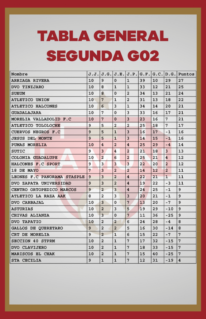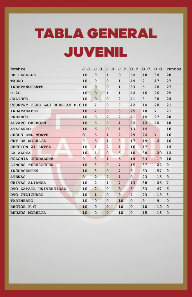 TABLAS RAMA LIBRE JORNADA 10 enero 24, 2024 Estas son las estadísticas después de disputarse diez jornadas en el campeonato de la Liga Municipal de Morelia. *Si tu equipo tiene un error, se tiene que hacer la aclaración por medio de tu delegado en las oficinas de la Liga.