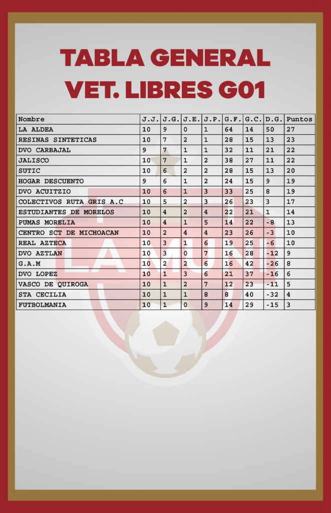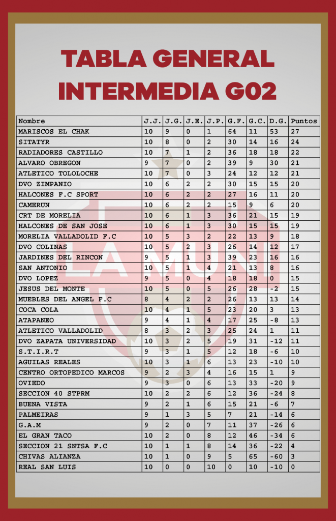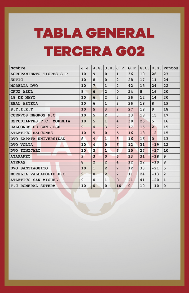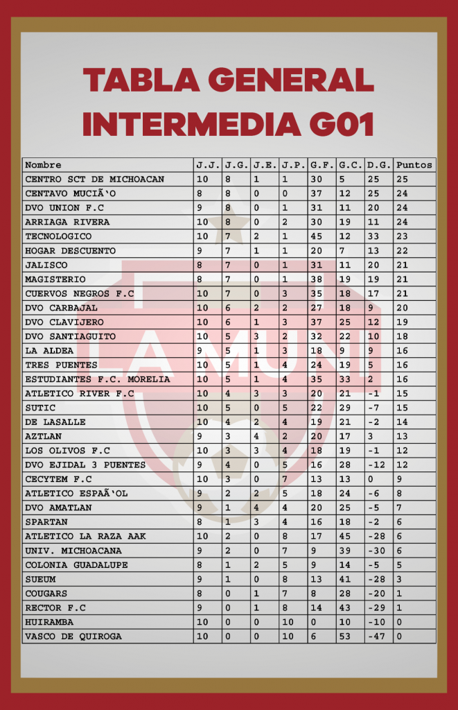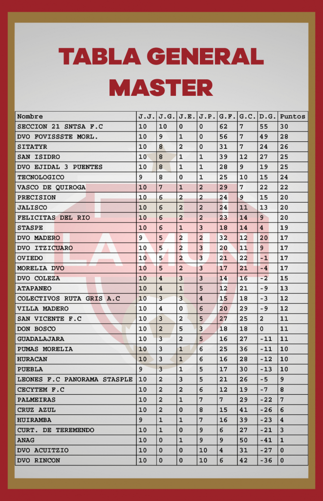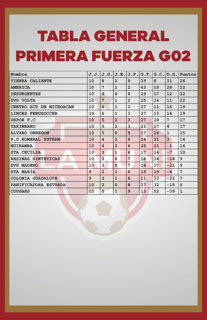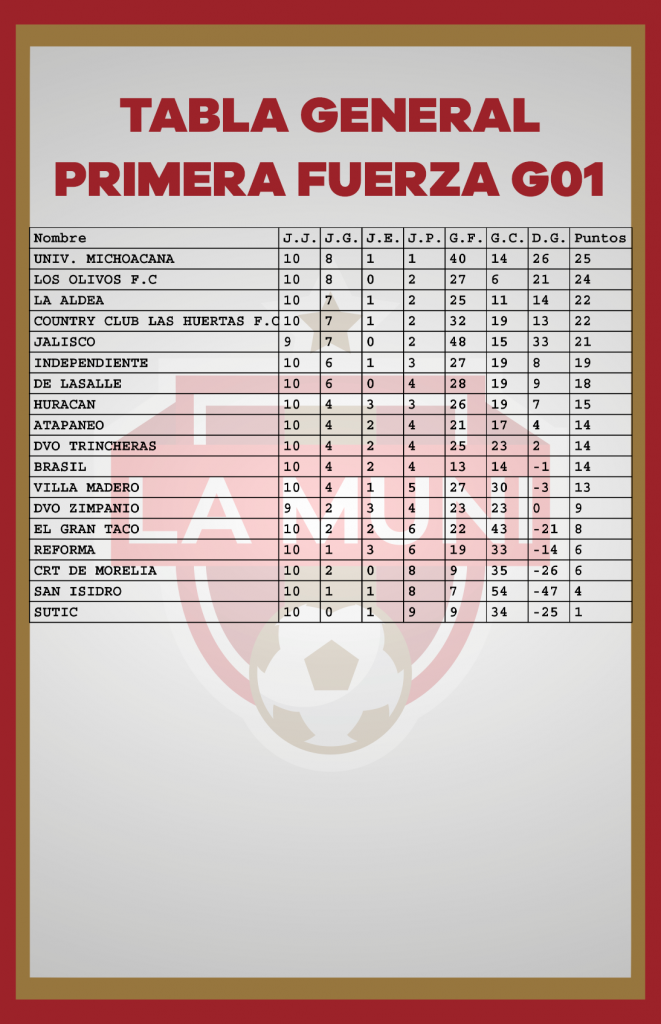 TABLAS RAMA LIBRE JORNADA 10 enero 24, 2024 Estas son las estadísticas después de disputarse diez jornadas en el campeonato de la Liga Municipal de Morelia. *Si tu equipo tiene un error, se tiene que hacer la aclaración por medio de tu delegado en las oficinas de la Liga.